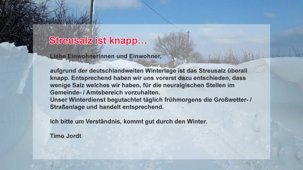 Wie in den vergangenen Jahren, möchte ich auch in diesem Jahr an die winterliche Räum- und Streupflicht der Gehwege im Zeitraum von 07:00 bis 20:00 Uhr vor Ihrem Grundstück erinnern. Auch möchte ich die Grundstückseigentümer bitten, Bäume, Sträucher und Hecken, die in den Straßenbereich hereinwachsen, die freie Sicht behindern oder die Straßenlaternen vor einer freien Ausleuchtung hindern, zu beseitigen.