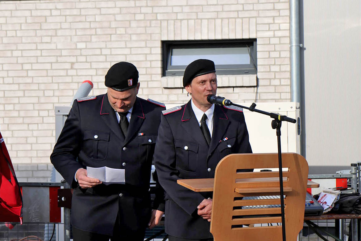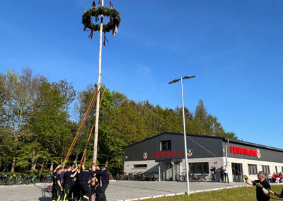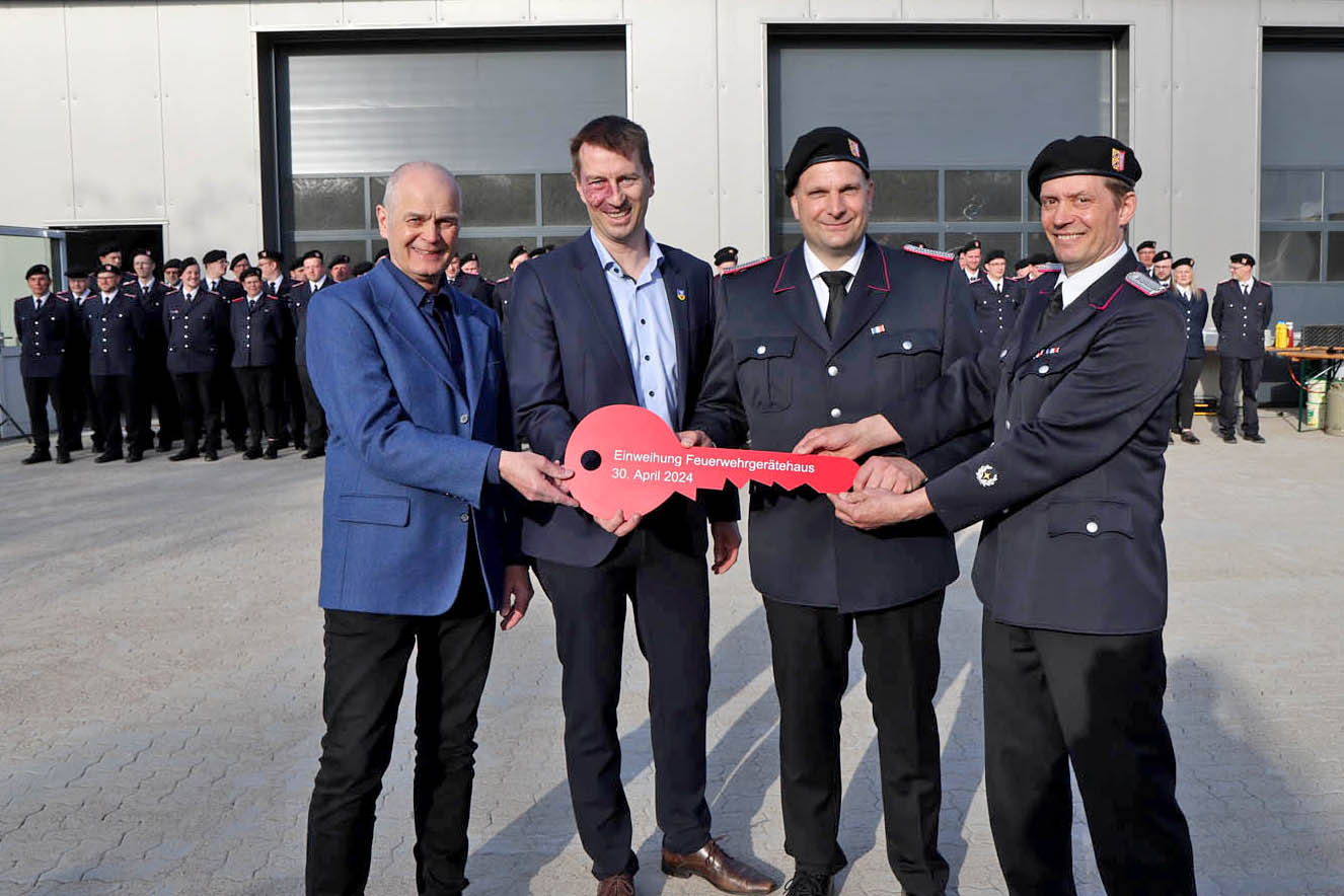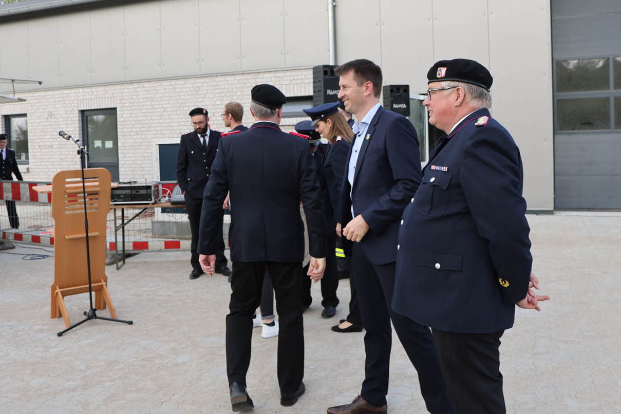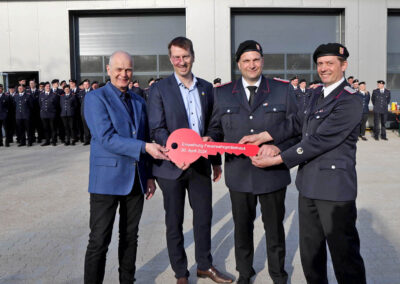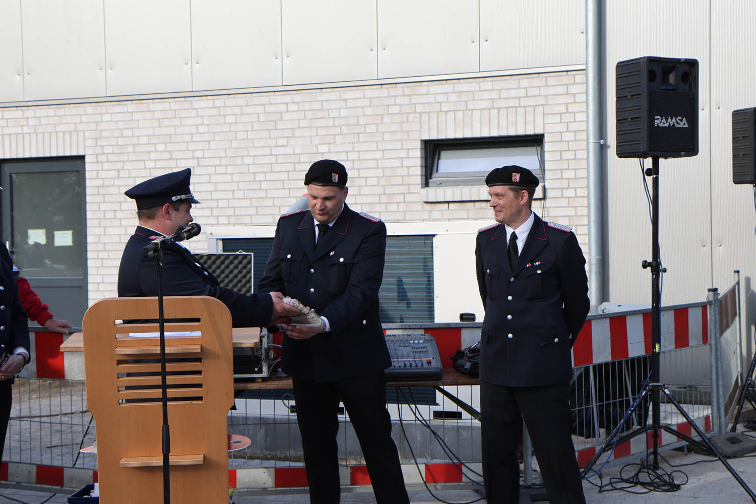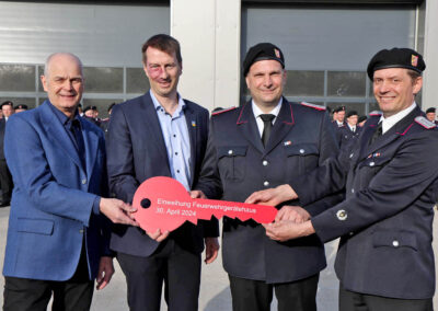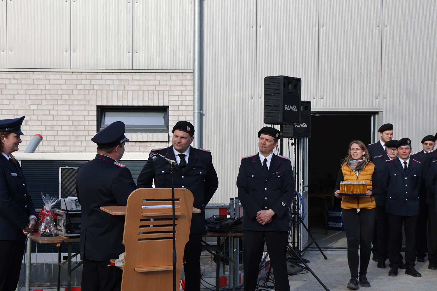Nach dem die beiden Wehren gemeinsam den Maibaum an seinen neuen Bestimmungsort gebracht haben, begann der offizielle Teil mit den Grußreden aus Politik, Feuerwehren und dem Architekten. Am Ende wurde die Schlüssel symbolisch an die Wehrführer übergeben.